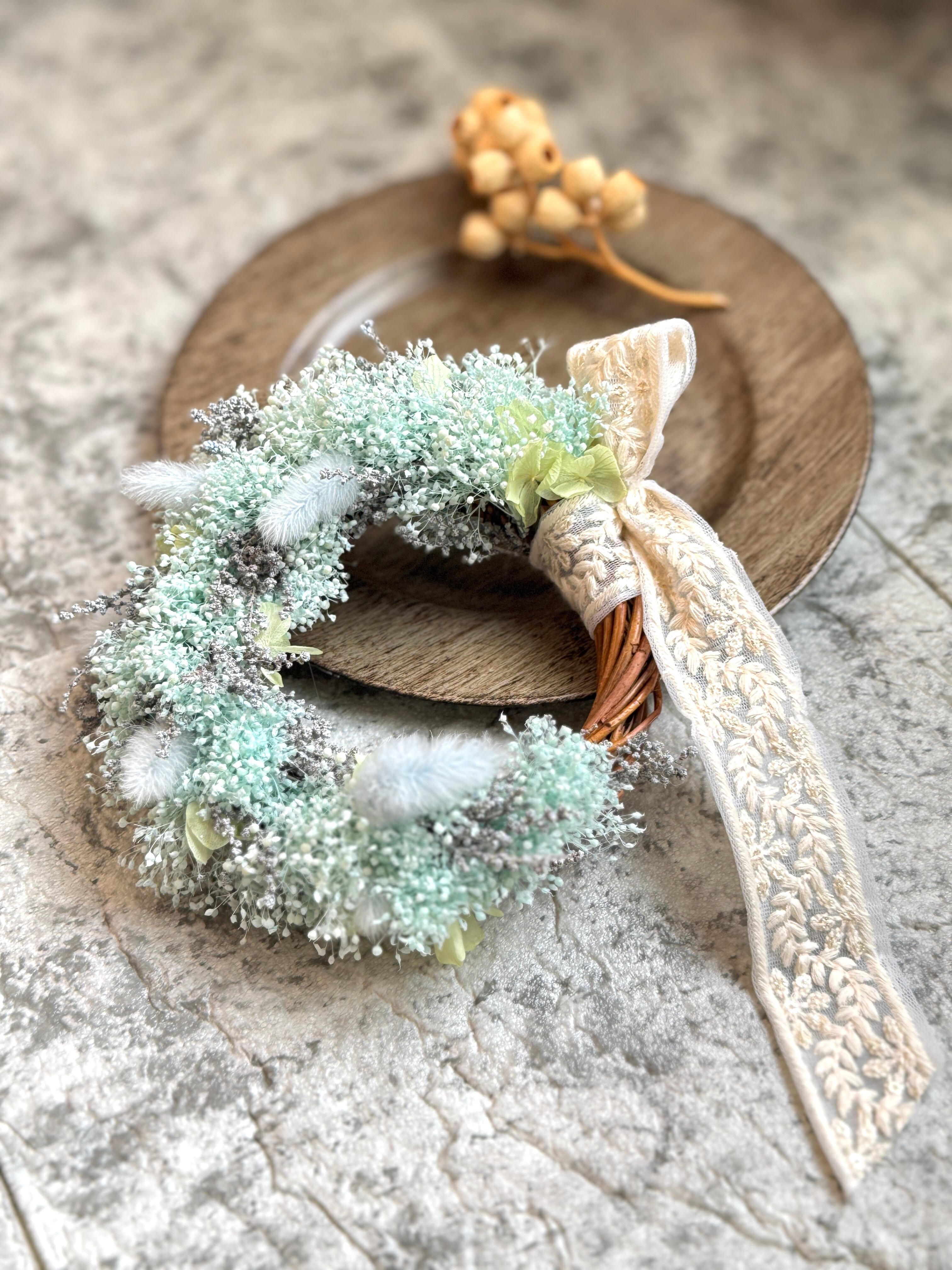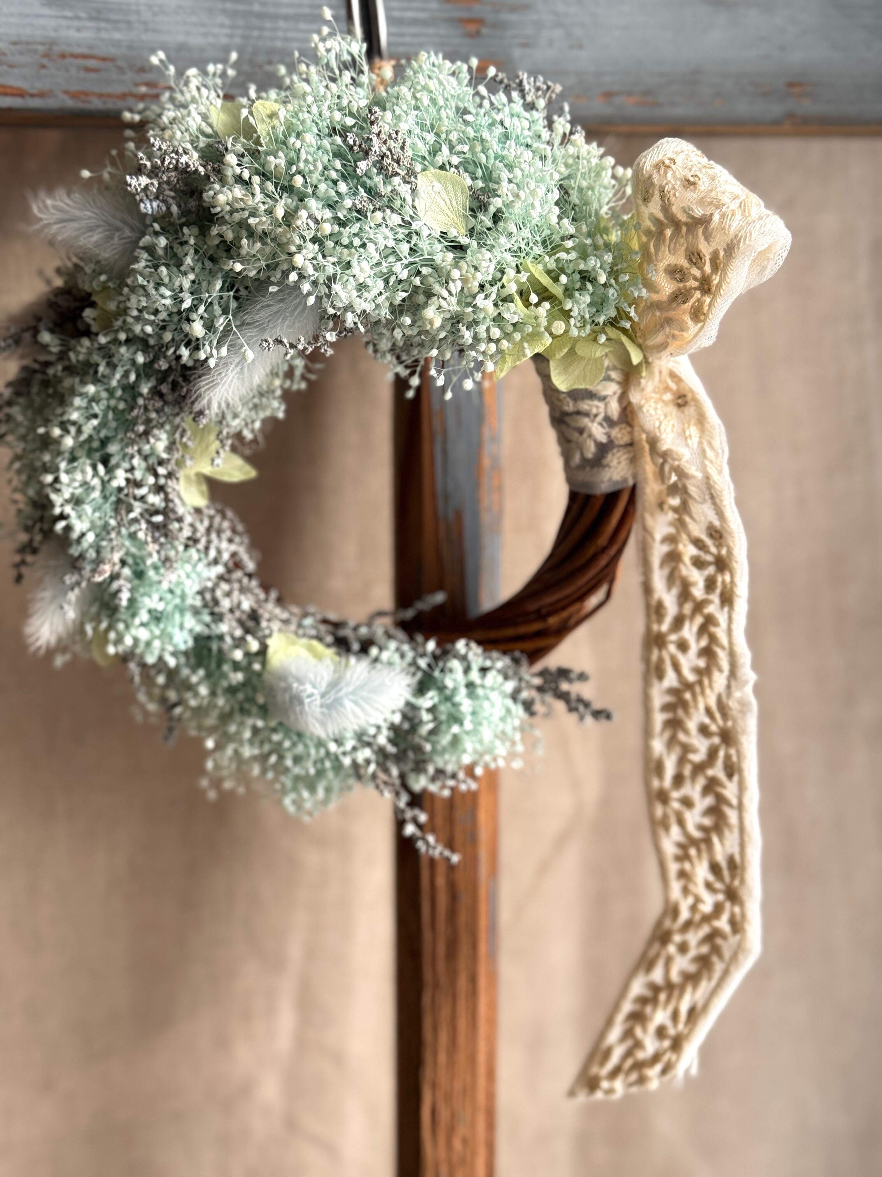 プリザーブドフラワーのカスミソウを贅沢にあしらった、小さなリースです。
